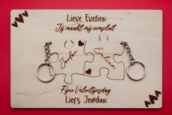 Ben je op zoek naar het ultieme valentijnscadeau? Deze houten valentijnskaart bevat puzzelstukjes die je altijd bij je kan dragen aan je sleutelbos en een lief berichtje. Dit is het perfecte cadeau om iemand te laten zien dat je aan hem/haar denkt. De sleutelhangers vormen samen een geheel dat symboliseert hoe jullie elkaar aanvullen. Door er een berichtje bij te plaatsen heb je een kaart en cadeautje in één. Zo ben je altijd met elkaar verbonden én kan je met een persoonlijke boodschap dit cadeau nog unieker maken. Verras je geliefde met deze houten valentijnskaart om zo te laten weten hoeveel iemand voor je betekent.